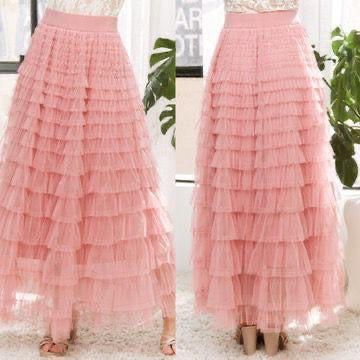 Falda larga con olanes en color solido tela tipo mesh con resorte en cintura