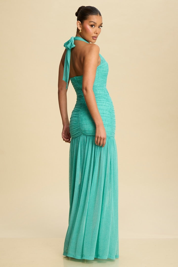 Vestido halter en tela mesh color verde turquesa, con forro y transparencia en la parte de abajo, se ajusta con cierre.