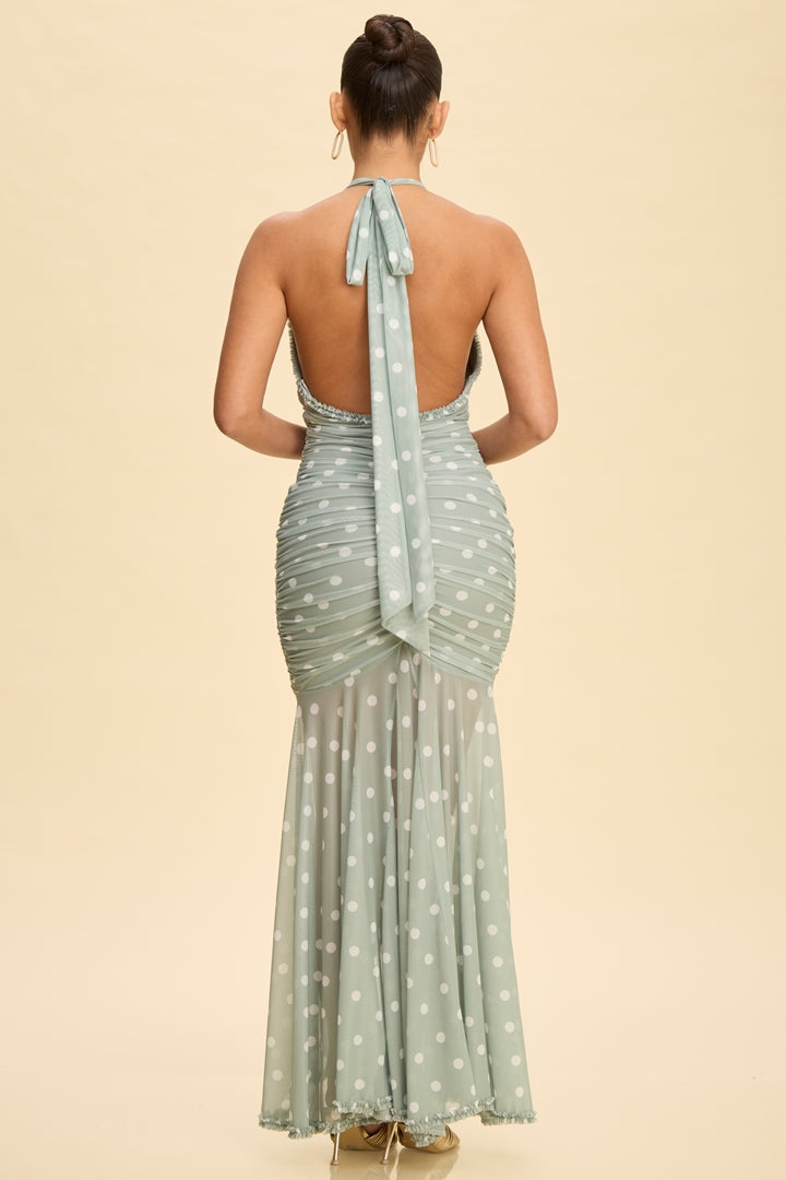 Vestido polka dots sage y blanco con tela mesh y corte sirena que estiliza la figura. Diseño ajustado con escote corazón fruncido y tirantes delgados. Presenta drapeado en la cintura y falda con detalle asimétrico y olanes que aportan movimiento. Tela stretch que se adapta cómodamente al cuerpo.
