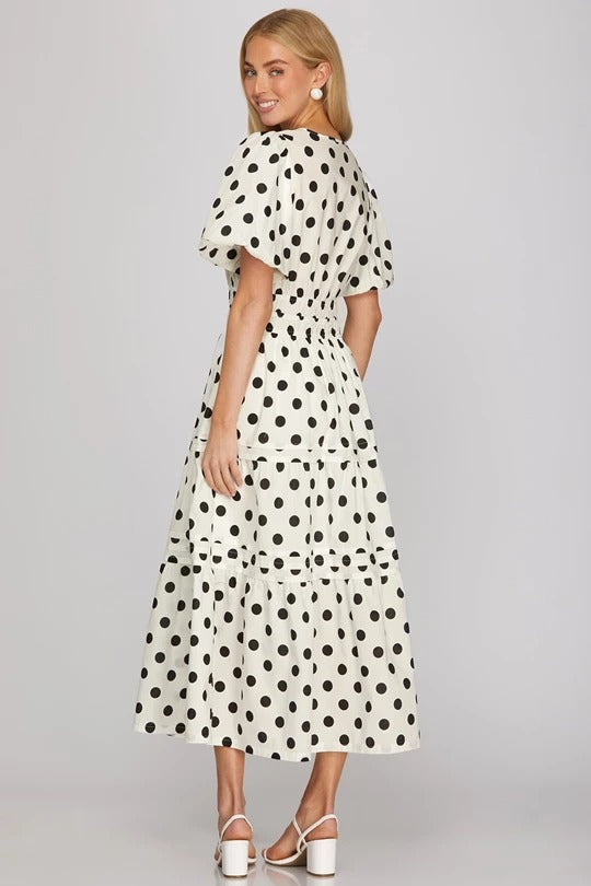 Vestido midi polka dots blanco  con negro, manga corta con resorte en cintura